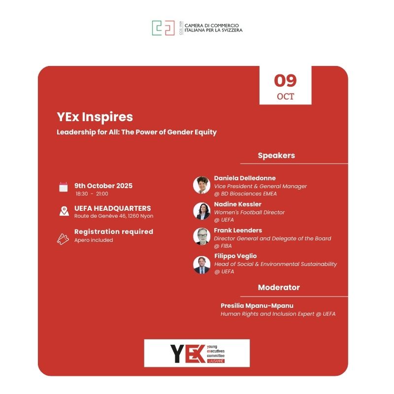 YEX Inspires is back for its second edition, this year focusing on Women in Leadership and Gender Equity. Join us for an engaging evening panel where leaders will share their journeys, challenges, and insights on why equity in leadership matters, and how it benefits organizations and society alike. The discussion will be followed by a networking aperitif, offering the perfect opportunity to connect, exchange ideas, and build community in an open and welcoming atmosphere.